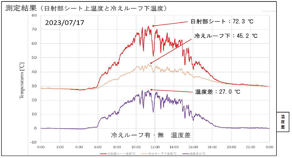 防水層表面は冷えルーフシート有りと無しの温度差が、最大26.3℃、20℃以上は下がる。